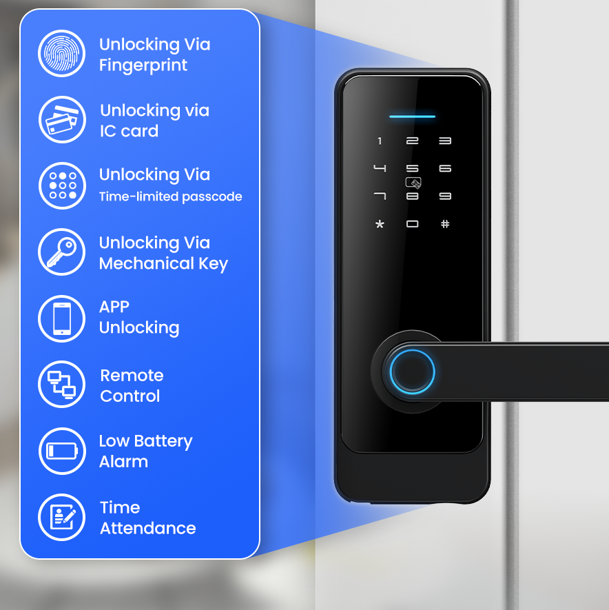 Remote control: WiFi and Bluetooth-based access via the Tuya or TTlock apps, enabling remote locking/unlocking of locks and real-time alerts.