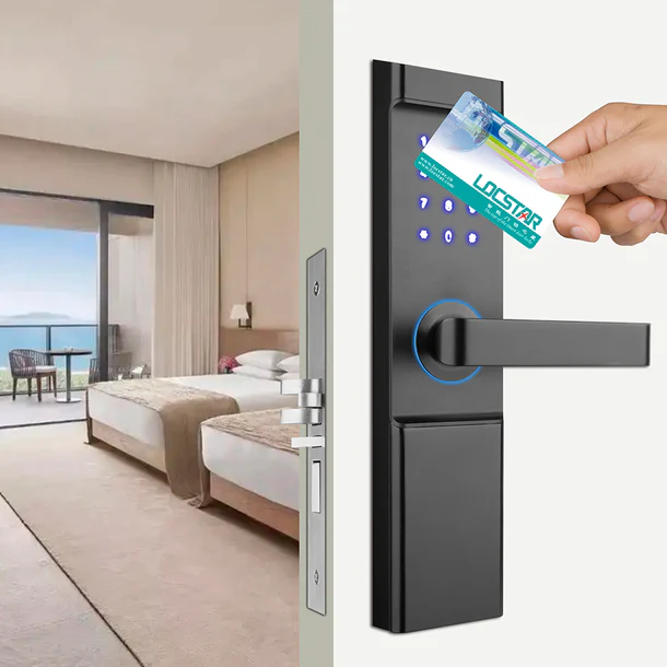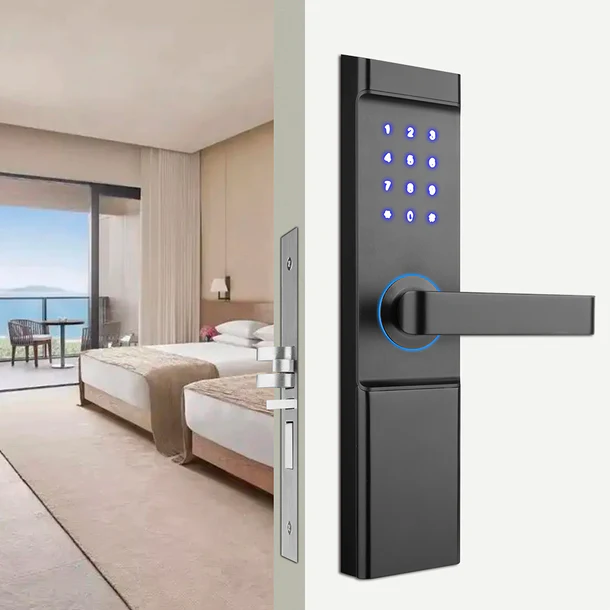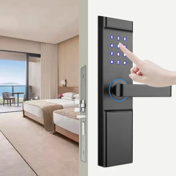 8058L-FM Modern WiFi Hotel Smart Lock: Designed specifically for hotels, with fast fingerprint recognition, encrypted RFID cards, and WiFi-based remote management. It provides modern access with military-grade security instead of physical keys.